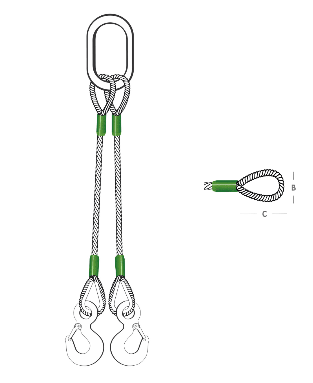 O laço de cabo de aço tipo CB05 é formado por duas pernas de cabo de aço interligados por um anel de carga, cada um equipado com sapatilhas protetoras e ganchos tipo olhal nas extremidades inferiores. Quando necessário, pode ser fornecido com sapatilhas também nas extremidades superiores. Projetado para distribuir a carga em dois pontos de içamento, esse conjunto eleva a capacidade de manuseio sem exigir aumento do diâmetro do cabo, assegurando maior eficiência e segurança nas operações de elevação.